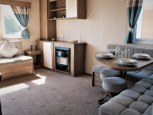 Cosy up in the open-plan lounge, complete with a coffee table, feature electric fire, TV stand and gorgeous upholstered wrap-around sofas, or enjoy the warm Welsh weather through the sliding patio doors. *Decking options available.*